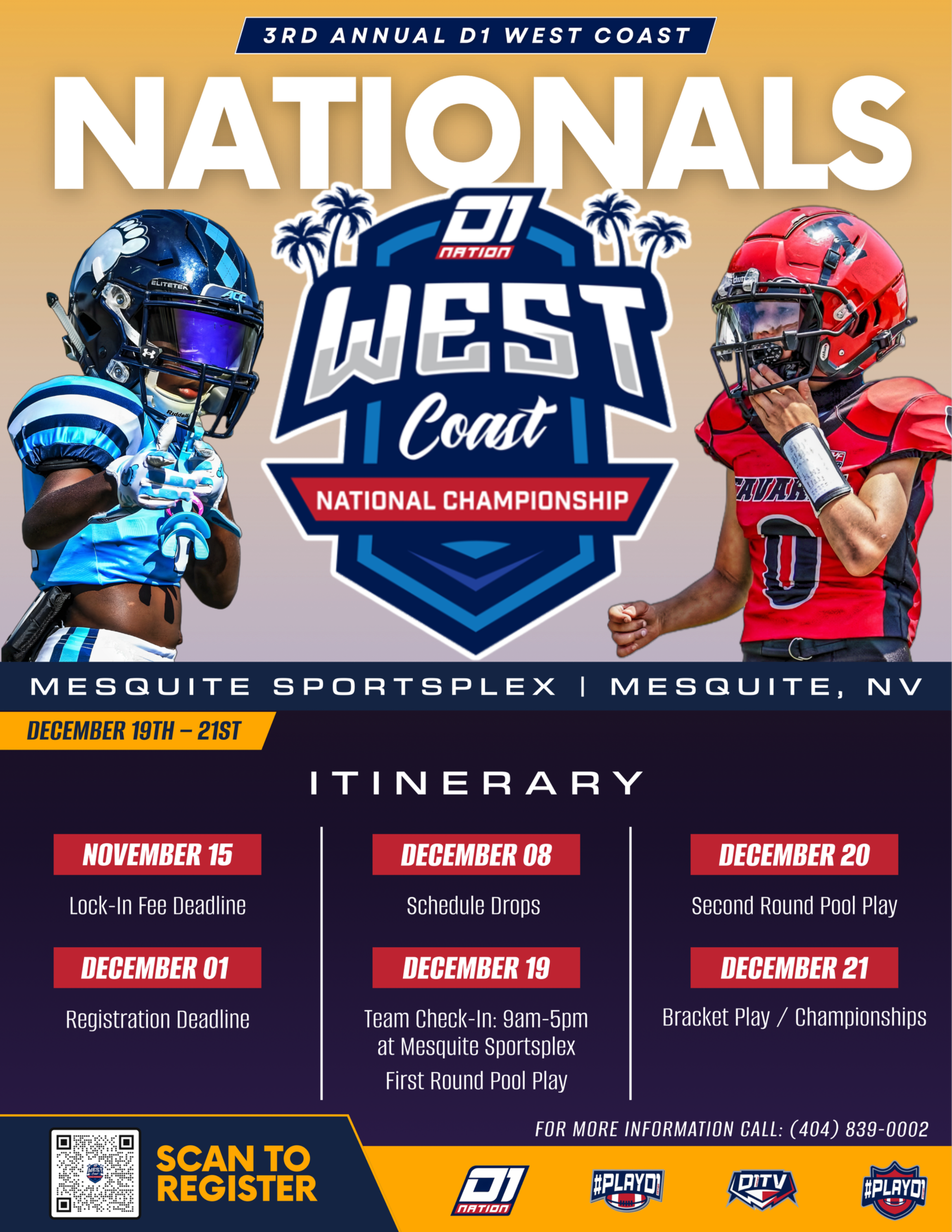 The D1 Nation West Coast National Championship takes place at the Mesquite Sportsplex in Mesquite, Nevada. Spanning synthetic turf and natural grass fields under lighting for early starts and late finishes, it combines tournament-scale amenities with a family-friendly atmosphere.